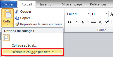 - dans l’onglet « Accueil » du Ruban Word, cliquez sur la flèche en dessous de Coller, puis sur l’option « Définir le collage par défaut… »